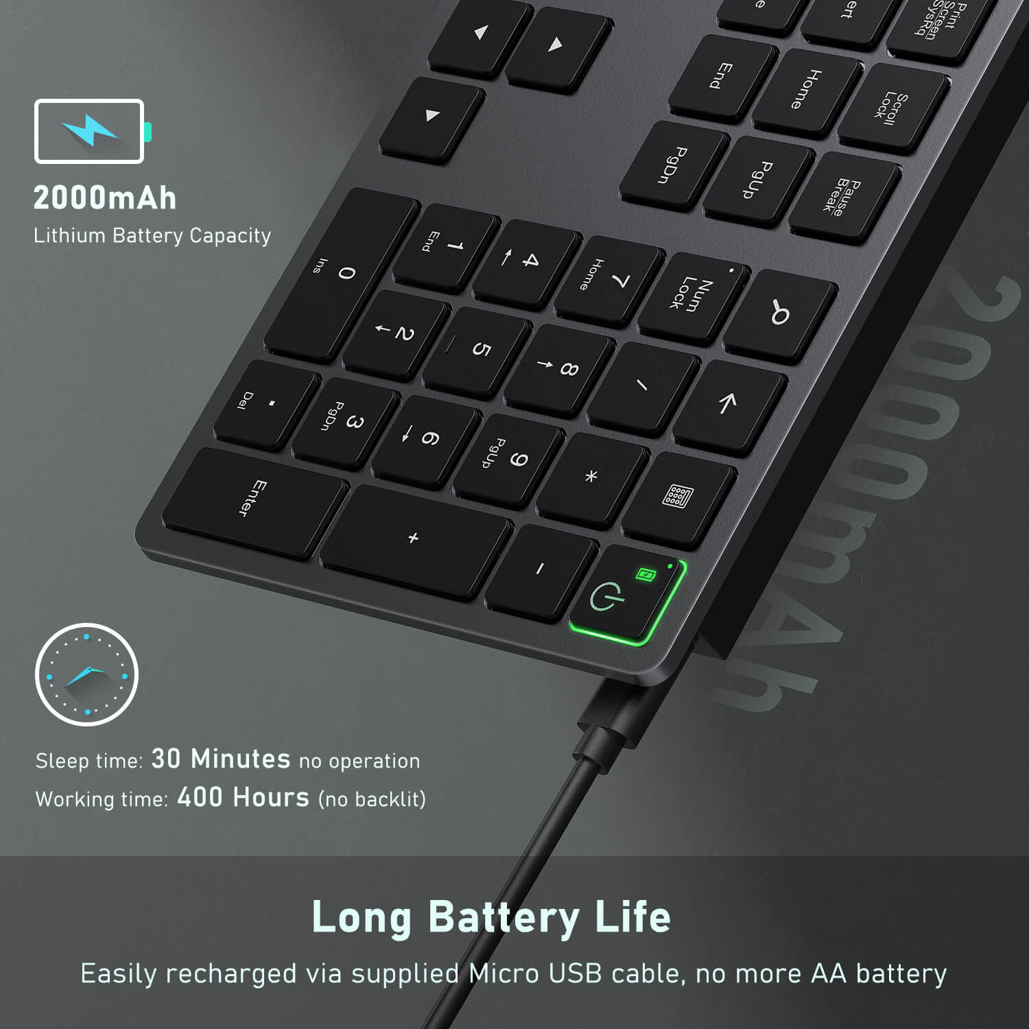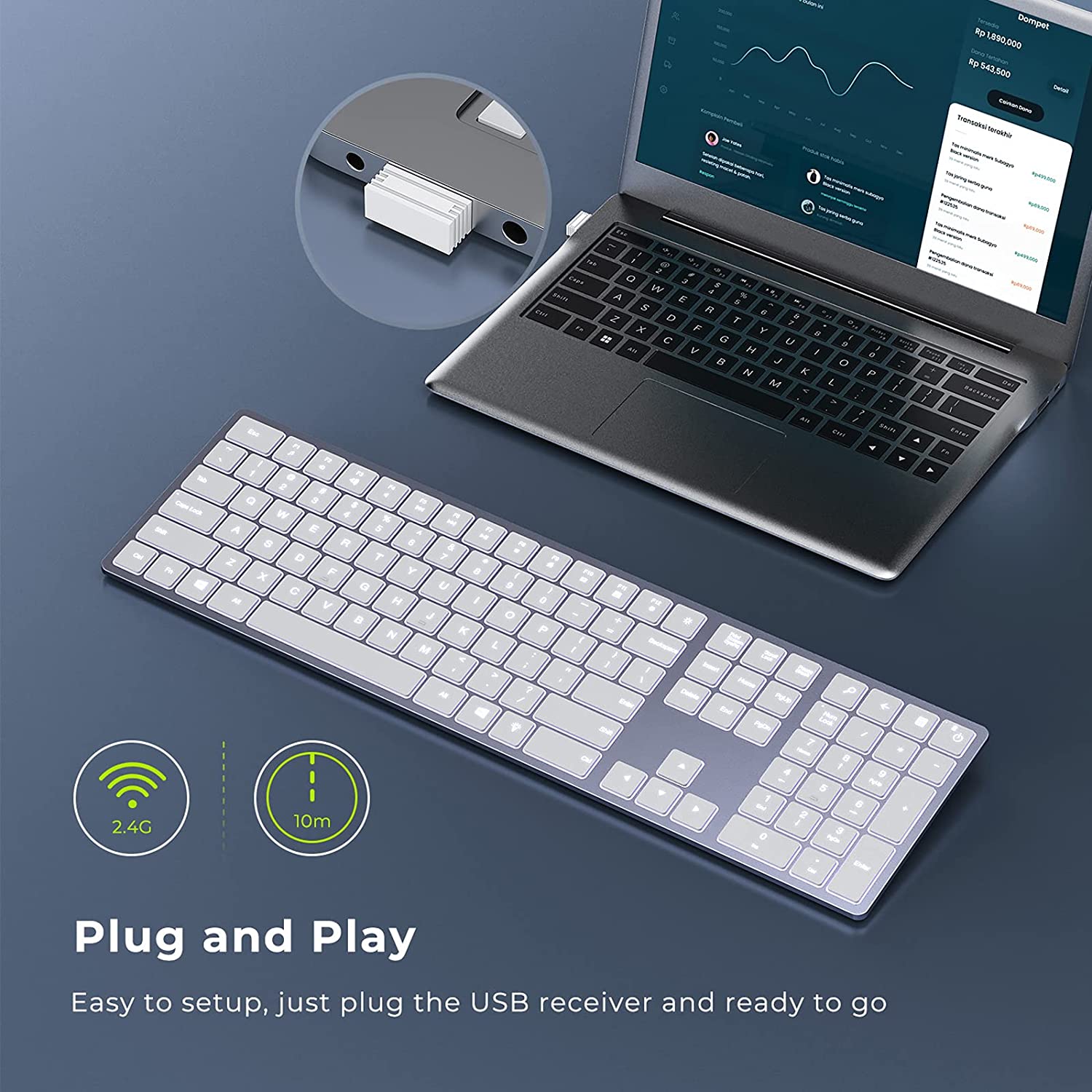 Schließen Sie es einfach an einen USB-Anschluss an und Ihre Tastatur ist einsatzbereit. Die leistungsstarke 2,4-G-Frequenz bietet Ihnen eine stabile drahtlose Verbindung, sodass Sie nie Probleme mit Verzögerungen haben werden.