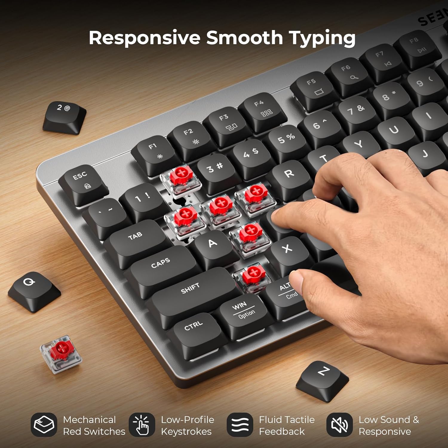 Seenda CUQ01 is a wireless mechanical keyboard and mouse combo made for multi-device workflows. With low-profile red switches, a quiet mouse, and easy switching across devices, it supports a more efficient setup for work, study, and daily use.