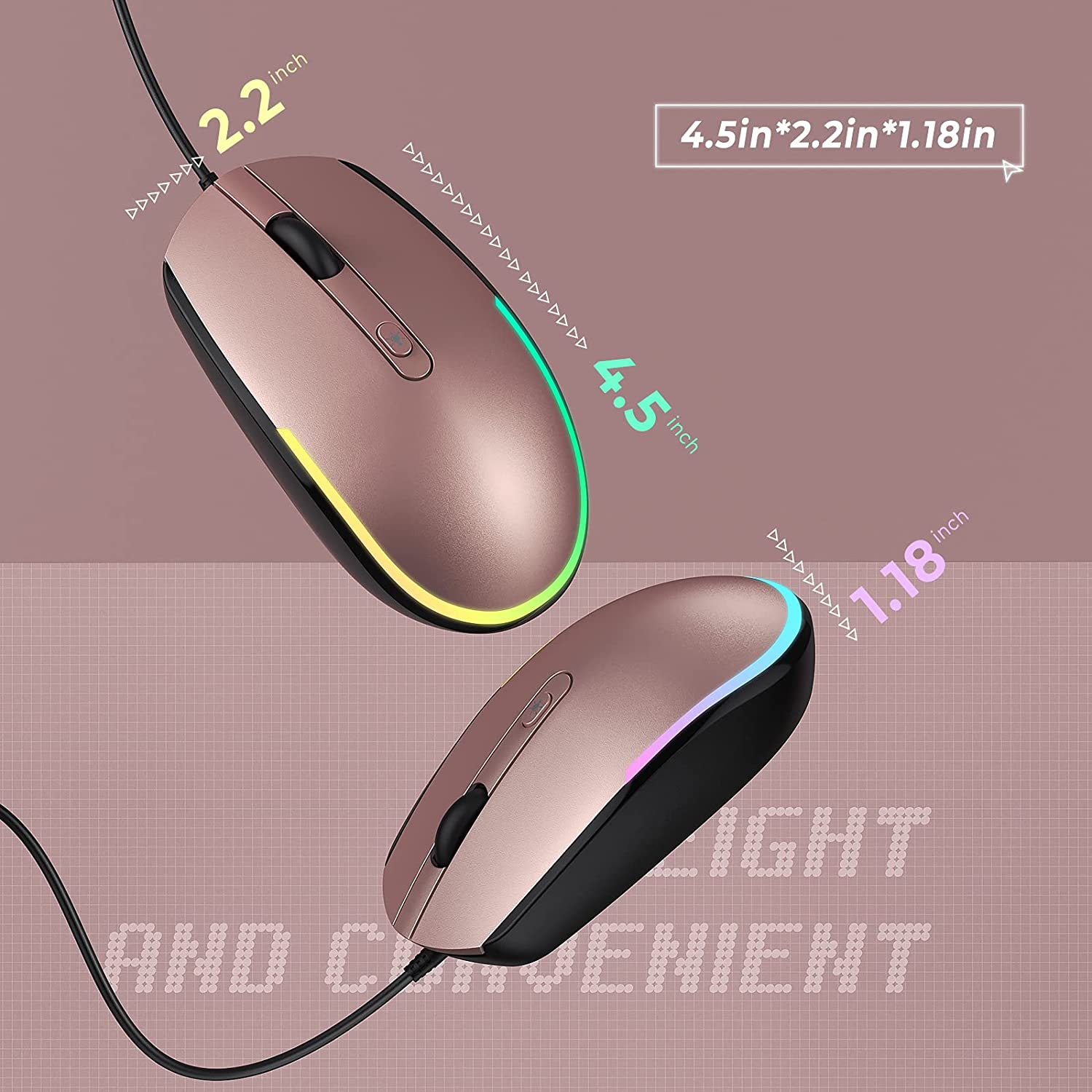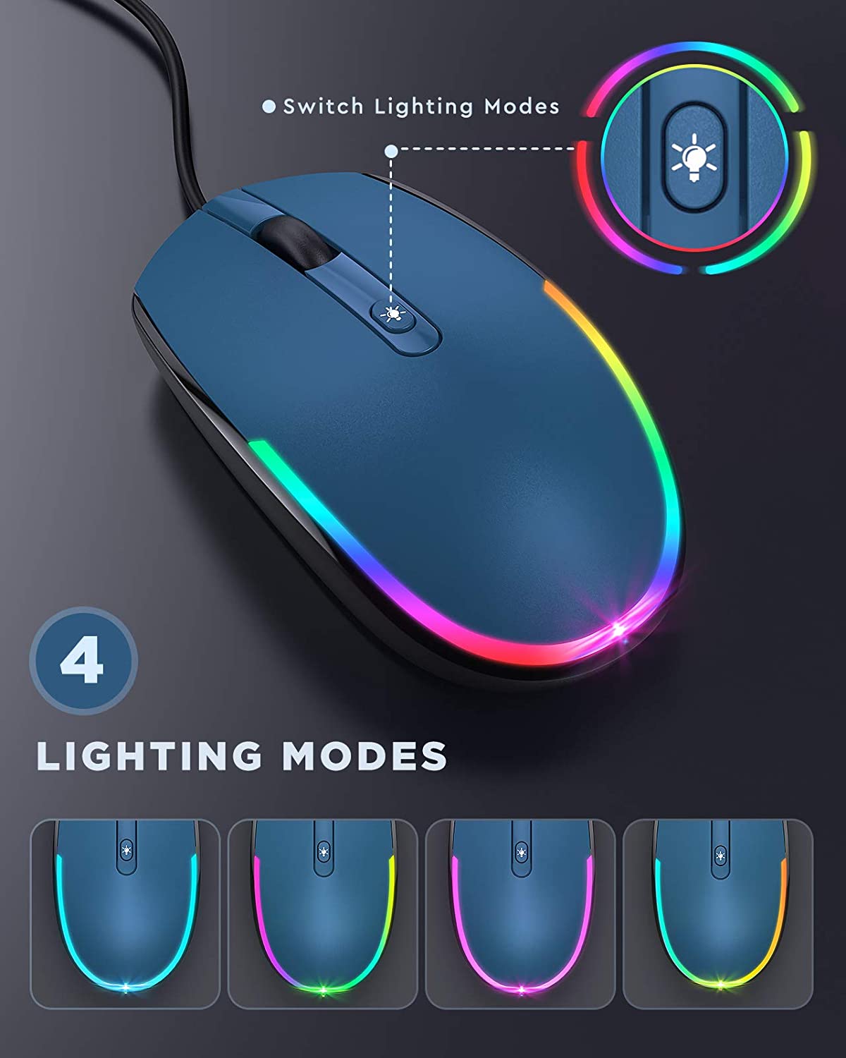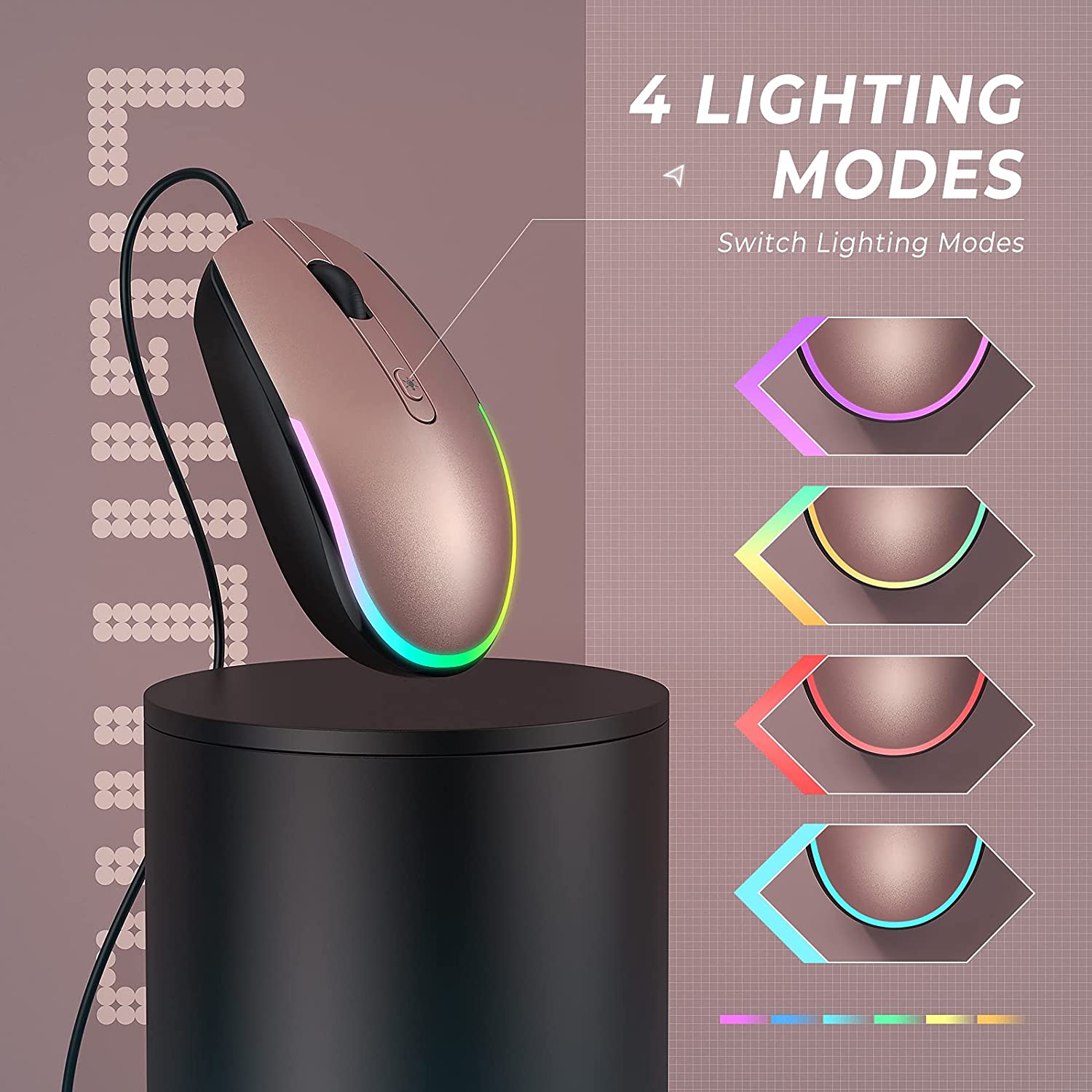 Die Maus leuchtet, wenn sie eingesteckt ist. Es sind 4 Beleuchtungsmodi verfügbar: Regenbogen-Atemlicht/Regenbogen-Streaming-Licht/Neon/Schwebendes Licht. Sie können die Lichter auch ausschalten, wenn sie nicht verwendet werden.