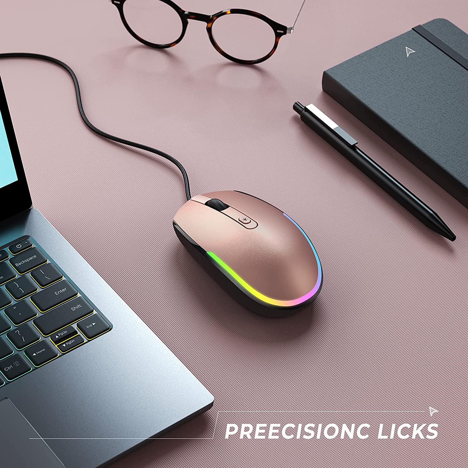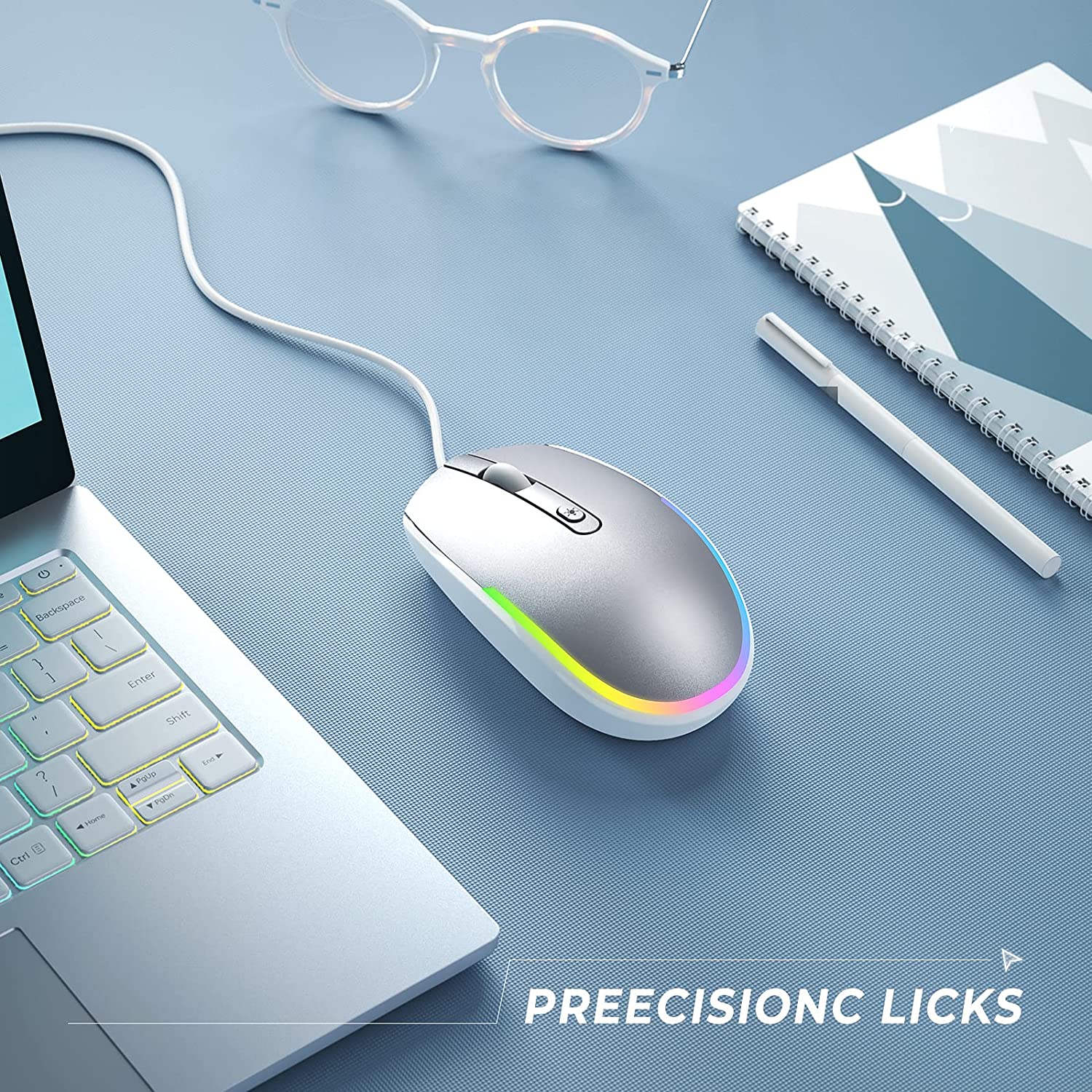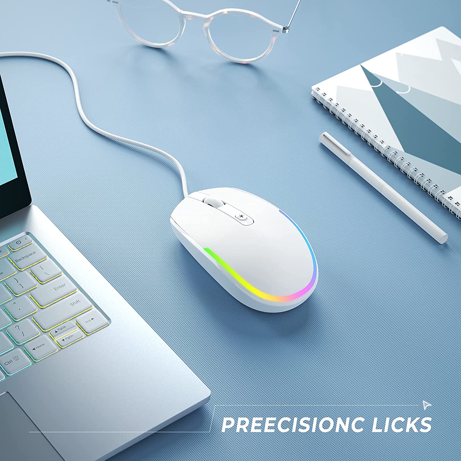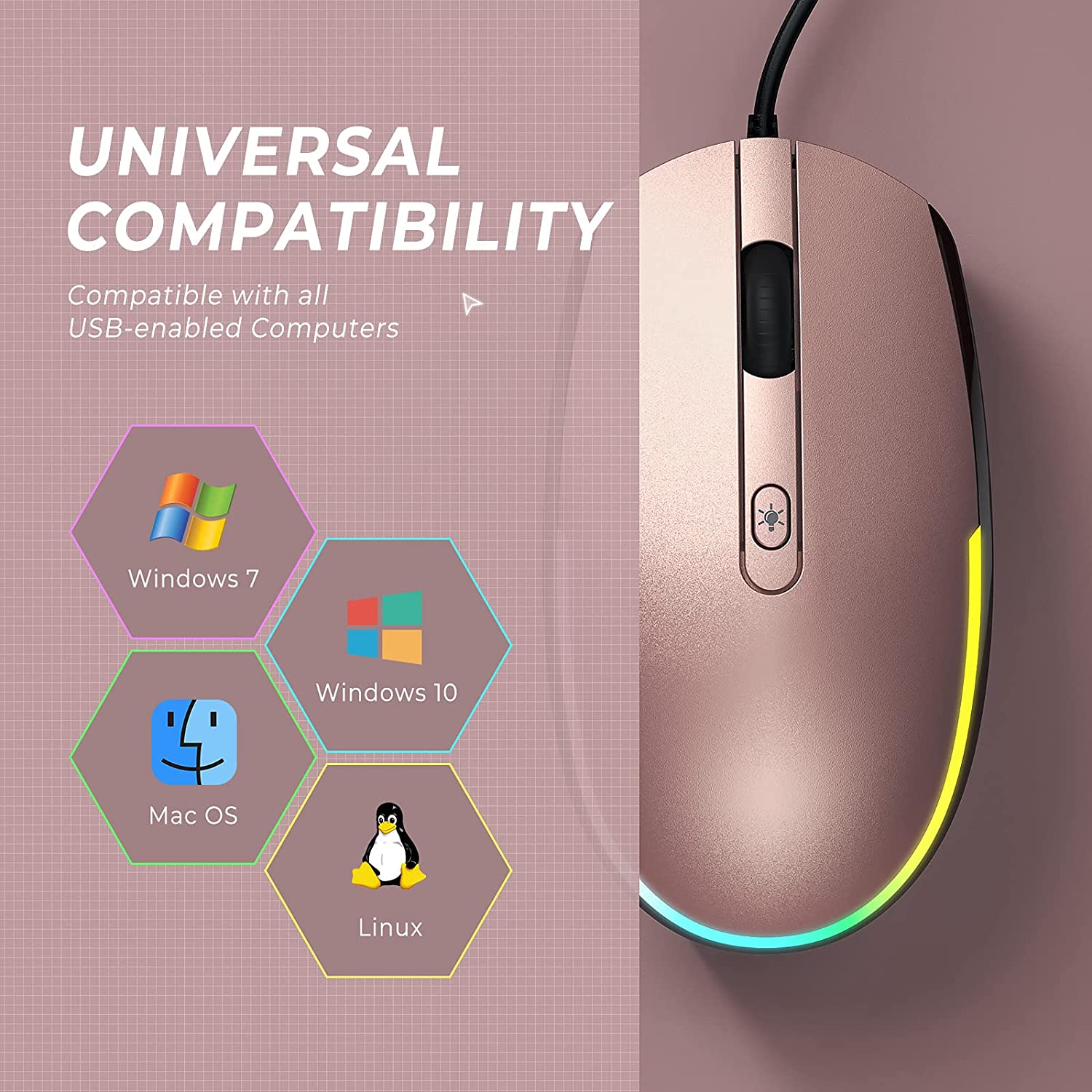 Die Maus leuchtet, wenn sie eingesteckt ist. Es sind 4 Beleuchtungsmodi verfügbar: Regenbogen-Atemlicht/Regenbogen-Streaming-Licht/Neon/Schwebendes Licht. Sie können die Lichter auch ausschalten, wenn sie nicht verwendet werden.