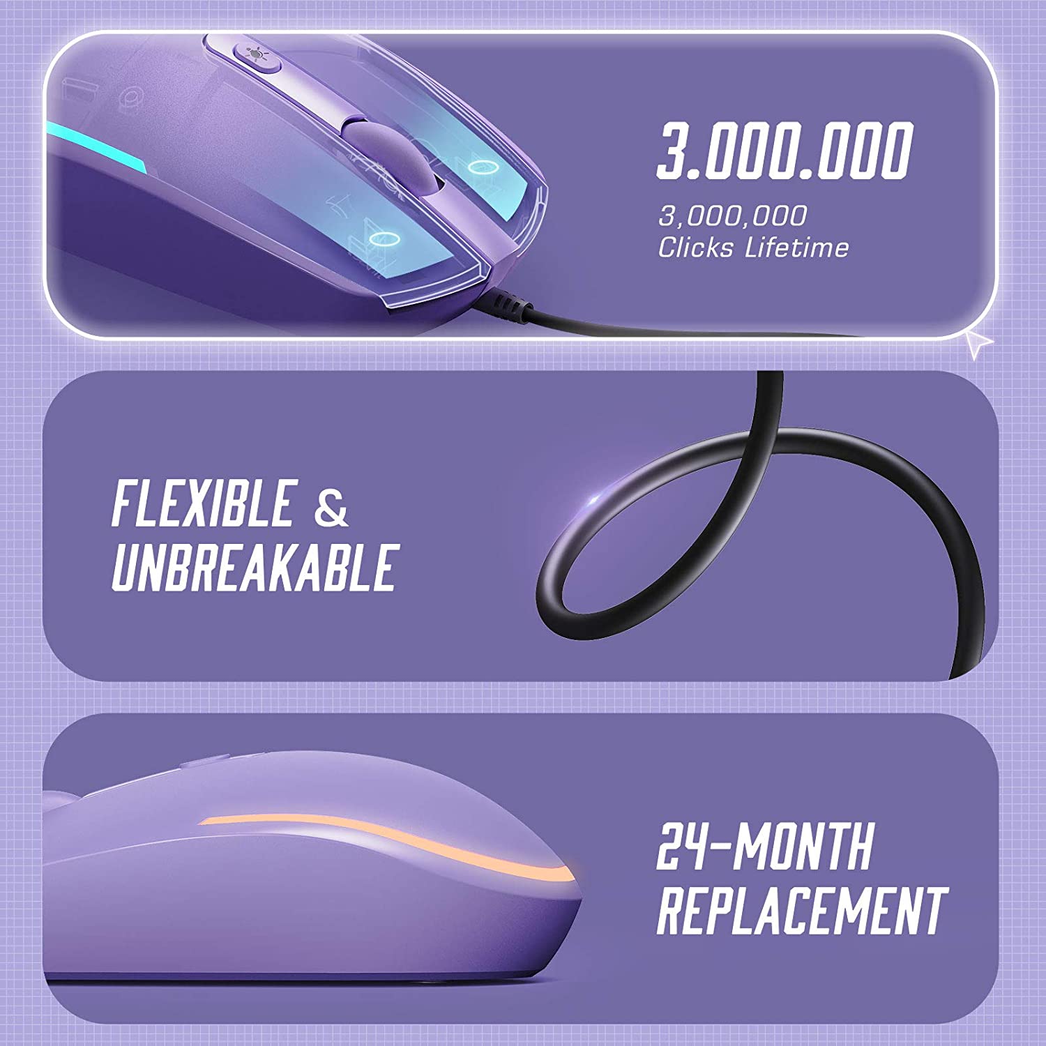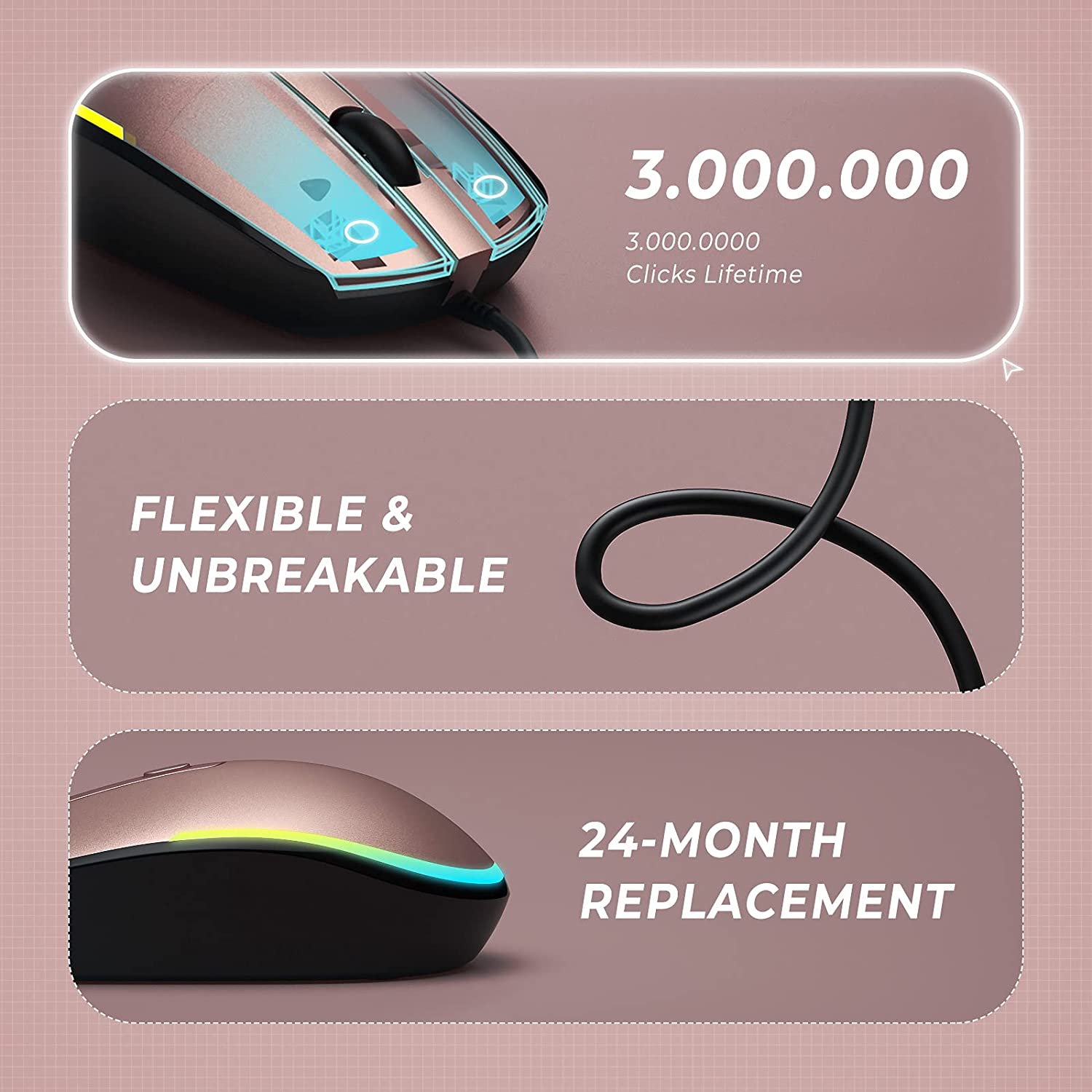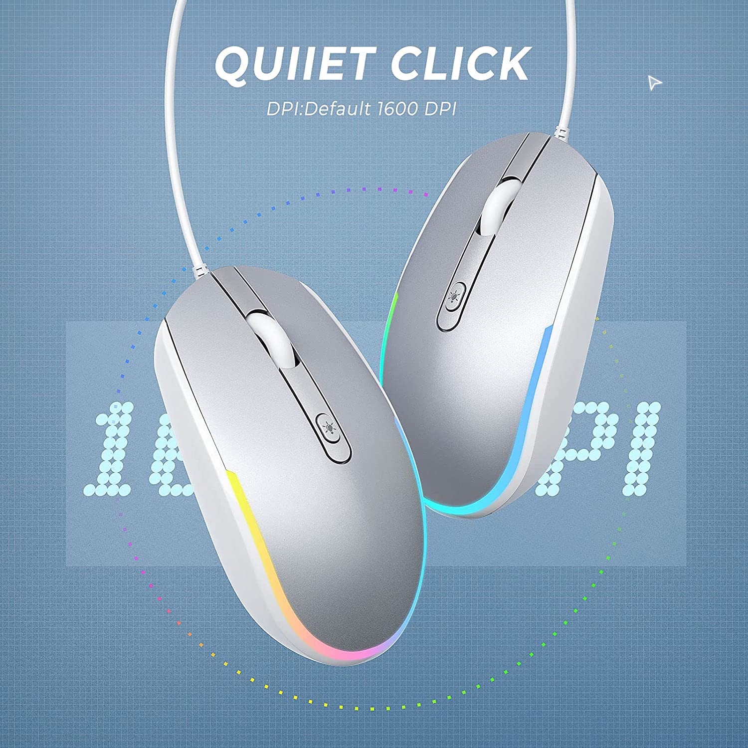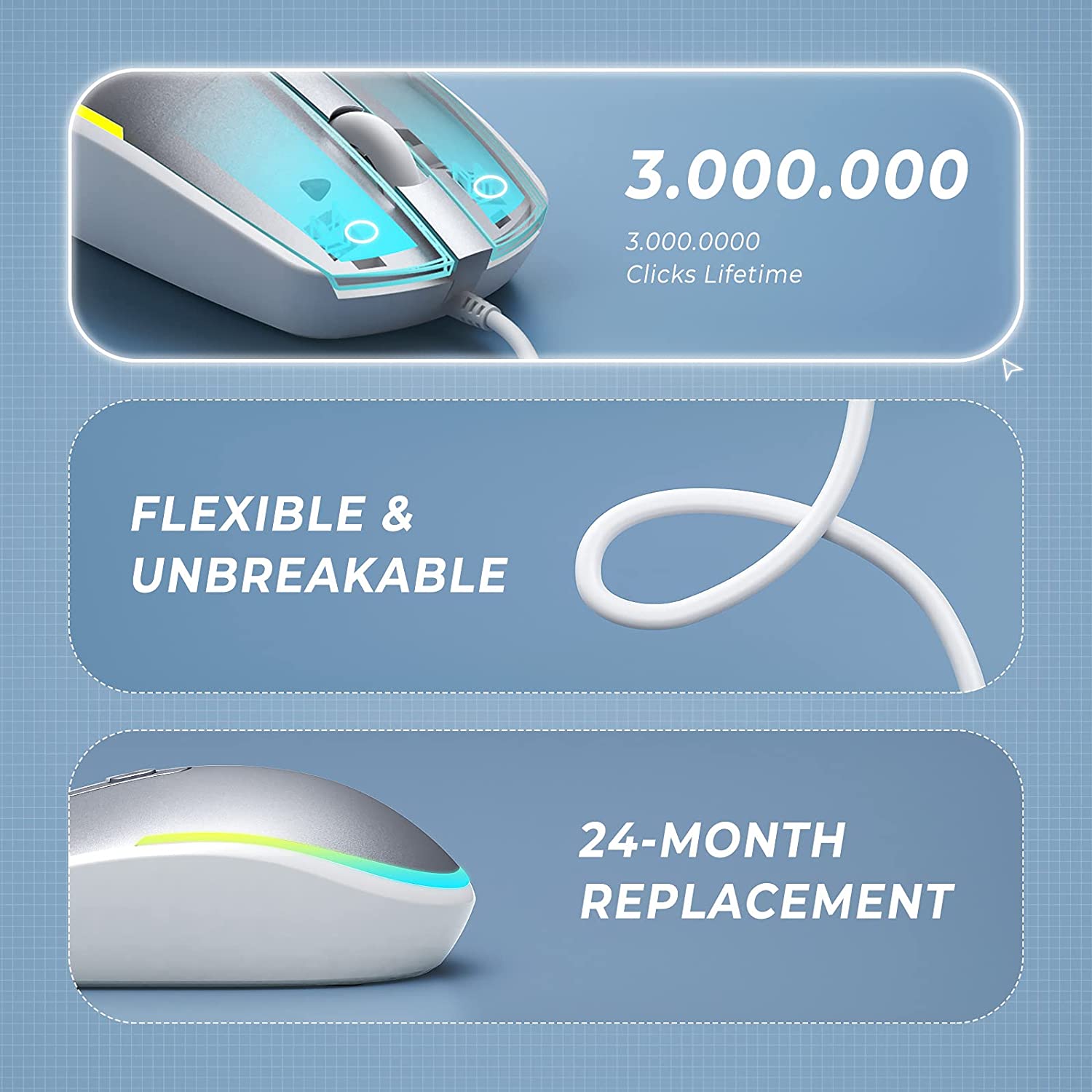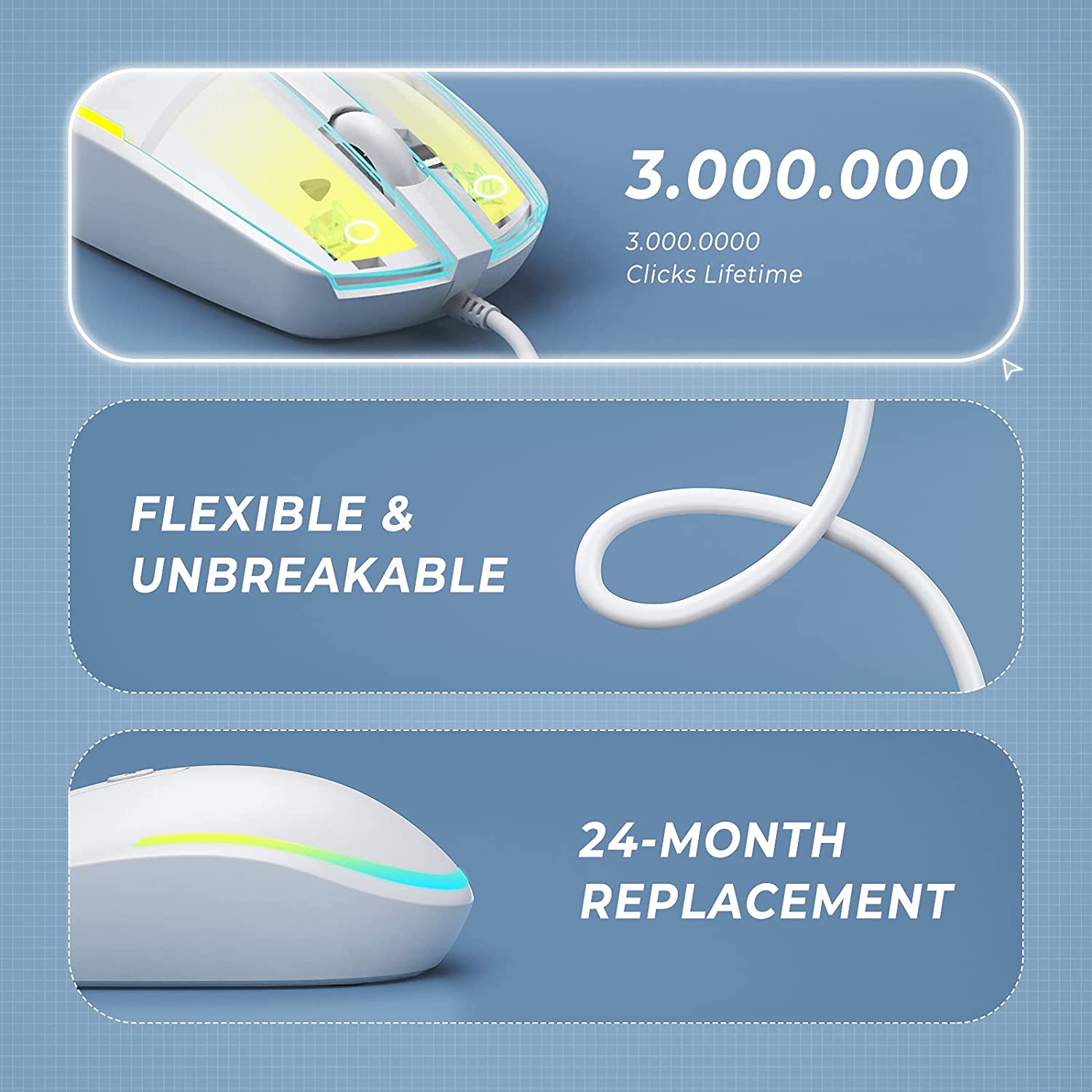 Kabelgebundene Maus mit leisem Klicken, keine Klickgeräusche bei der Verwendung der Maus, getestet auf über 3 Millionen Tastenanschläge, sorgt für reaktionsschnelles Klicken und längere Lebensdauer bei täglicher Verwendung.